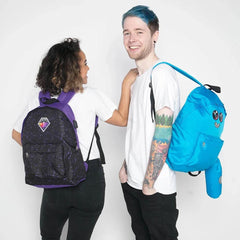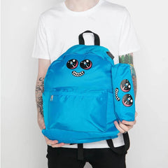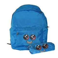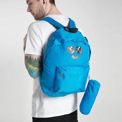 DanTDM blue backpack with rocket blast eyes and grinning teeth face design on the front. Comes with a matching design pencil case which is detachable from the backpack.